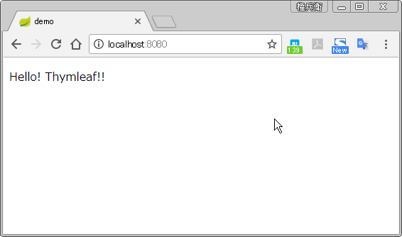 ブラウザから 「http://localhost:8080/」にアクセスすると、期待通り "Hello! Thymleaf!!" の文字列が表示されました。